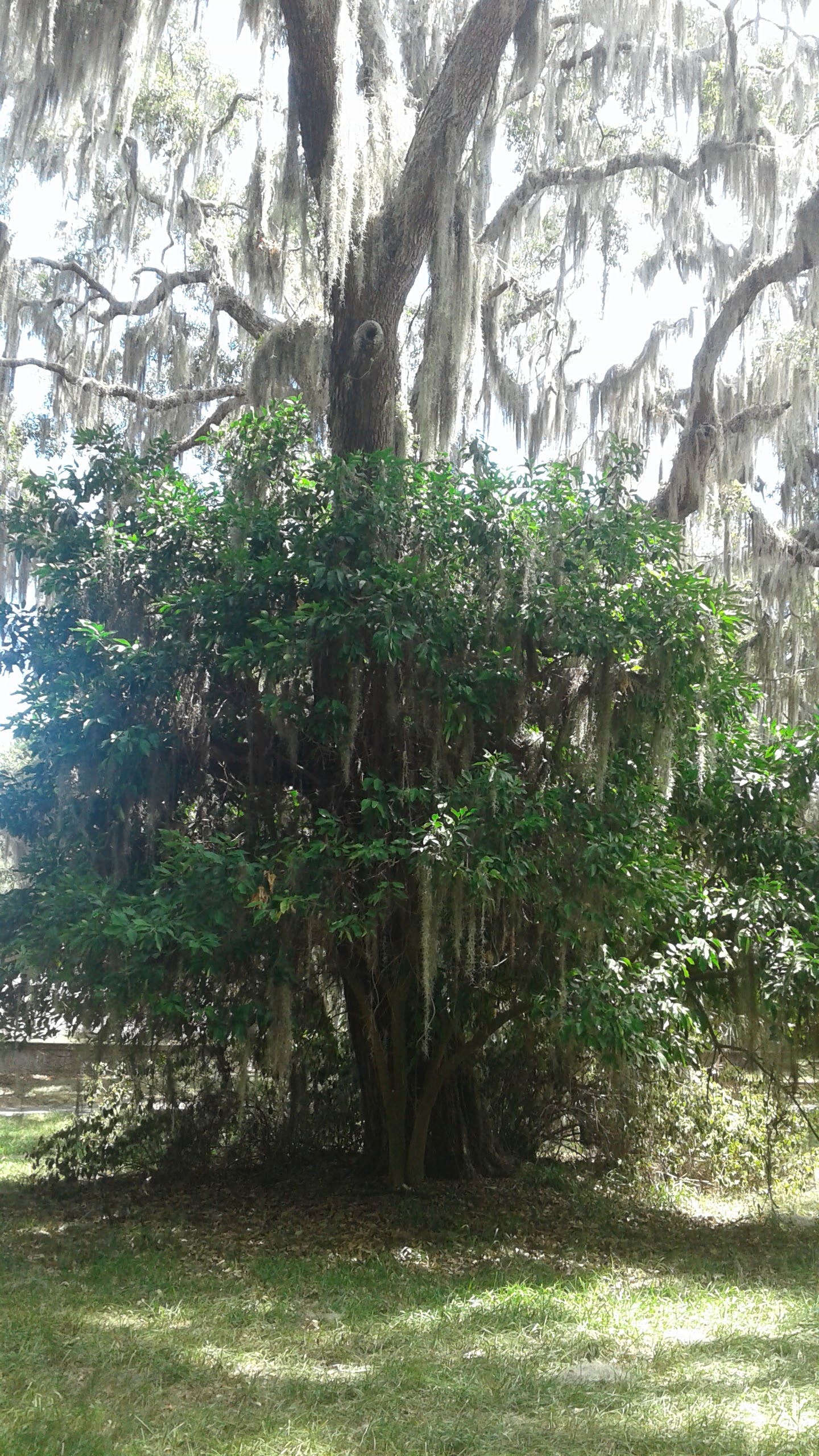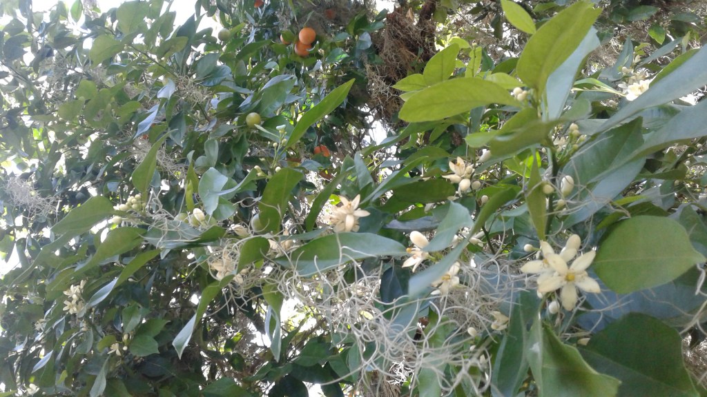 I am fascinated by the concept of epigenetic memory: that what an organism’s ancestors lived through survives in and alters its genetic patterns; it’s a more empirical (and therefore more respectable to those who may scorn the “fuzzier” concepts) form of ancestral memory. Like the dog or Bombyx mori, the orange tree is a species cultivated by humans. We have altered it on the genetic level so that it has adapted to us; therefore, I’m sure we are part of its epigenetic memory. Like the dog and the silkworm moth, then, it has an existence that is not ours and is apart from us, but it must on some level always be aware of us, the species that has etched our collective name in its DNA. I imagine these trees collecting and cataloging their memories of all of the people who have lived on the island–the generations of Gullah Geechee families, the rich men of the mansion, the doomed 18th-century French entrepreneurs, the Guale and Yamassee people, Captain Dunlop, the Spanish soldiers and priests. I imagine their roots holding the memory of the sunwarmed and well-watered soil of a garden in al-Andalus, or of being a dreaming seed carried westward in a pouch or pack along the Silk Road. It may be fanciful and even twee of me to say that, but on some level we all acknowledge the potential sentience of trees: there is a reason we all understand the concept of witness trees, trees which were present during a significant event in a significant place, and have survived long years since. These trees are landmarks in and of themselves, and we may touch the bark of a tree which was present at a particular time and wonder what it experienced and what it remembers.